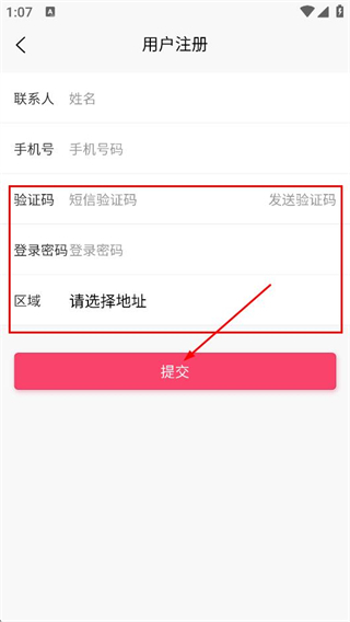 4、在注册页面,继续填写验证码、登录密码,选择区域,点击提交,完成账号注册。