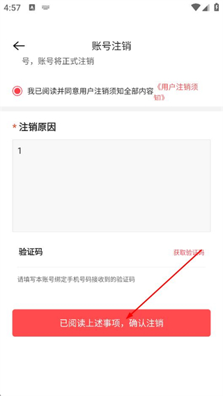 5、在账号注销页面,填写注销原因,并填入验证码后,点击确定注销,完成账号注销操作。
