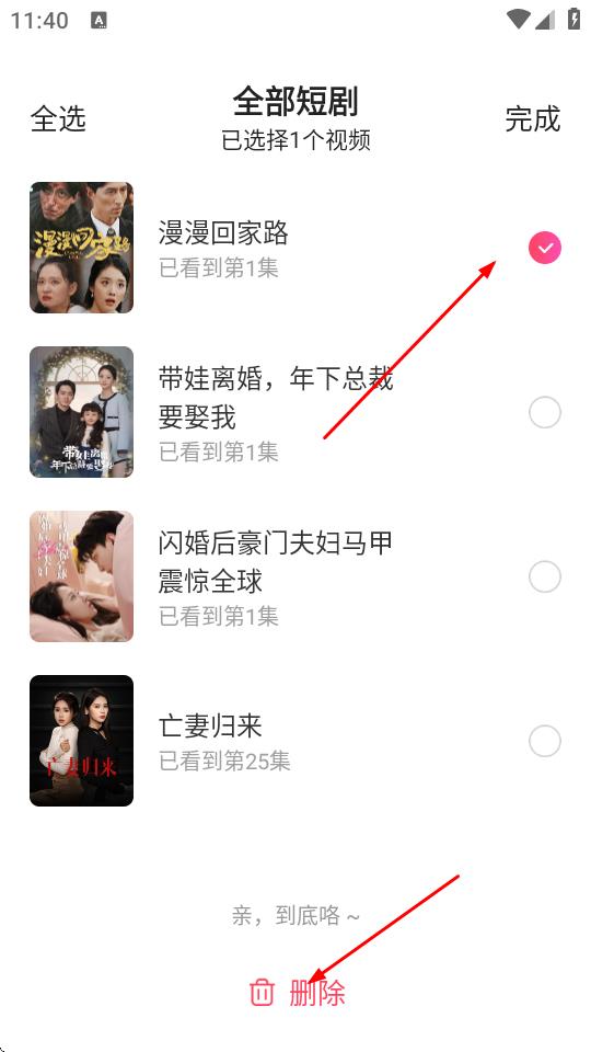 4、在全部短剧页面,勾选要删除记录的短剧,点击底部的删除按钮即可。