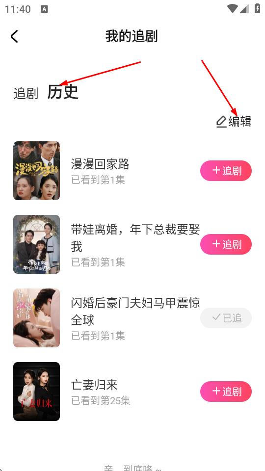3、进入我的追剧页面后,点击历史标签,再点击编辑。
