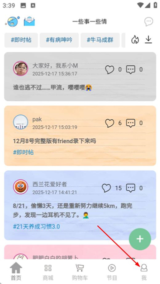 1、在一些事一些情首页,点击底部我选项,进入登录页面。