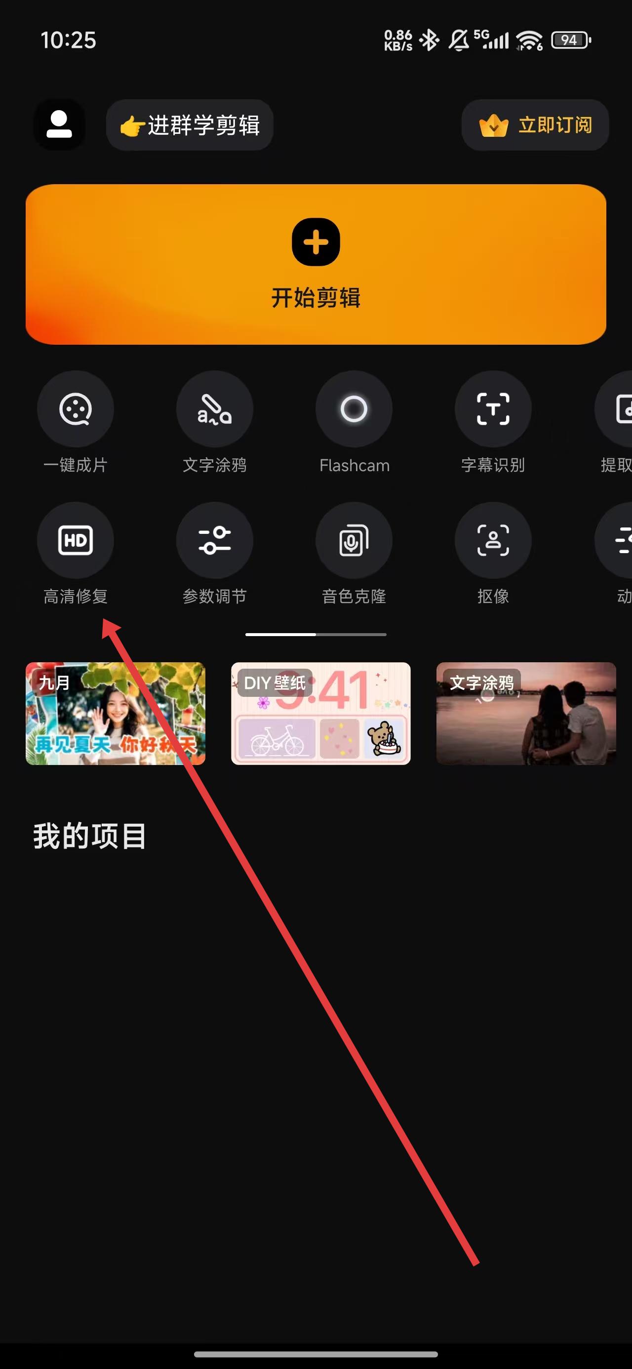 1、进入到小影app首页后,可以点击高清修复按钮,进行修复操作。