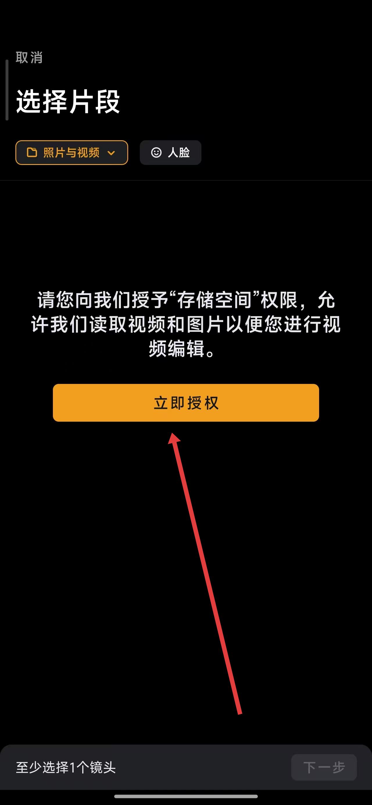 2、在进入选择片段时,需要点击立即授权按钮,先进行读取存储空间的授权。