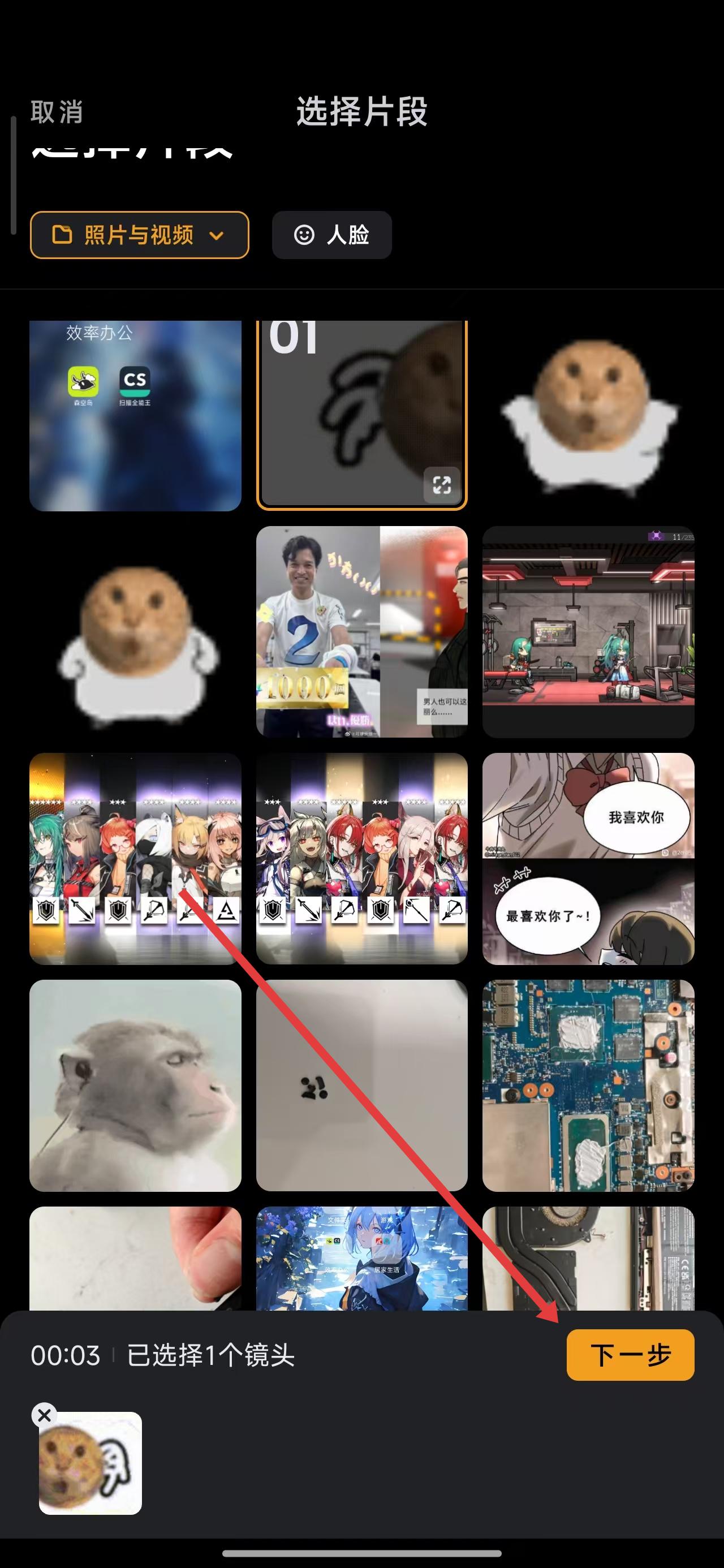 5. 长按逐帧编辑按钮可以跳到下一素材,方便快速选择;