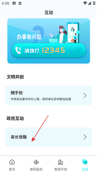2、在互动页面,点击政民互动下的县长信箱选项,进入县长信箱页面。