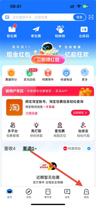 1、在菜鸟app界面,点击底部我的选项,进入个人页面。