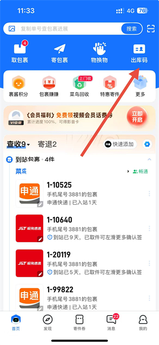 1、打开菜鸟裹裹APP,点击出库码选项进入出库码页面。