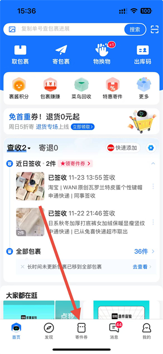 1、进入菜鸟主界面后,点击底部导航栏的寄件券选项,进入寄件相关页面。