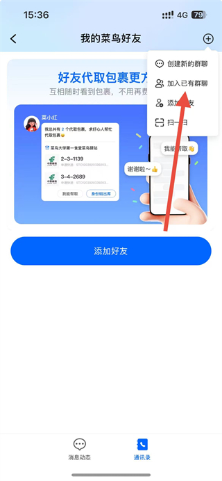 3、在我的菜鸟好友界面点击右上角的图标,选择加入已有群聊选项。