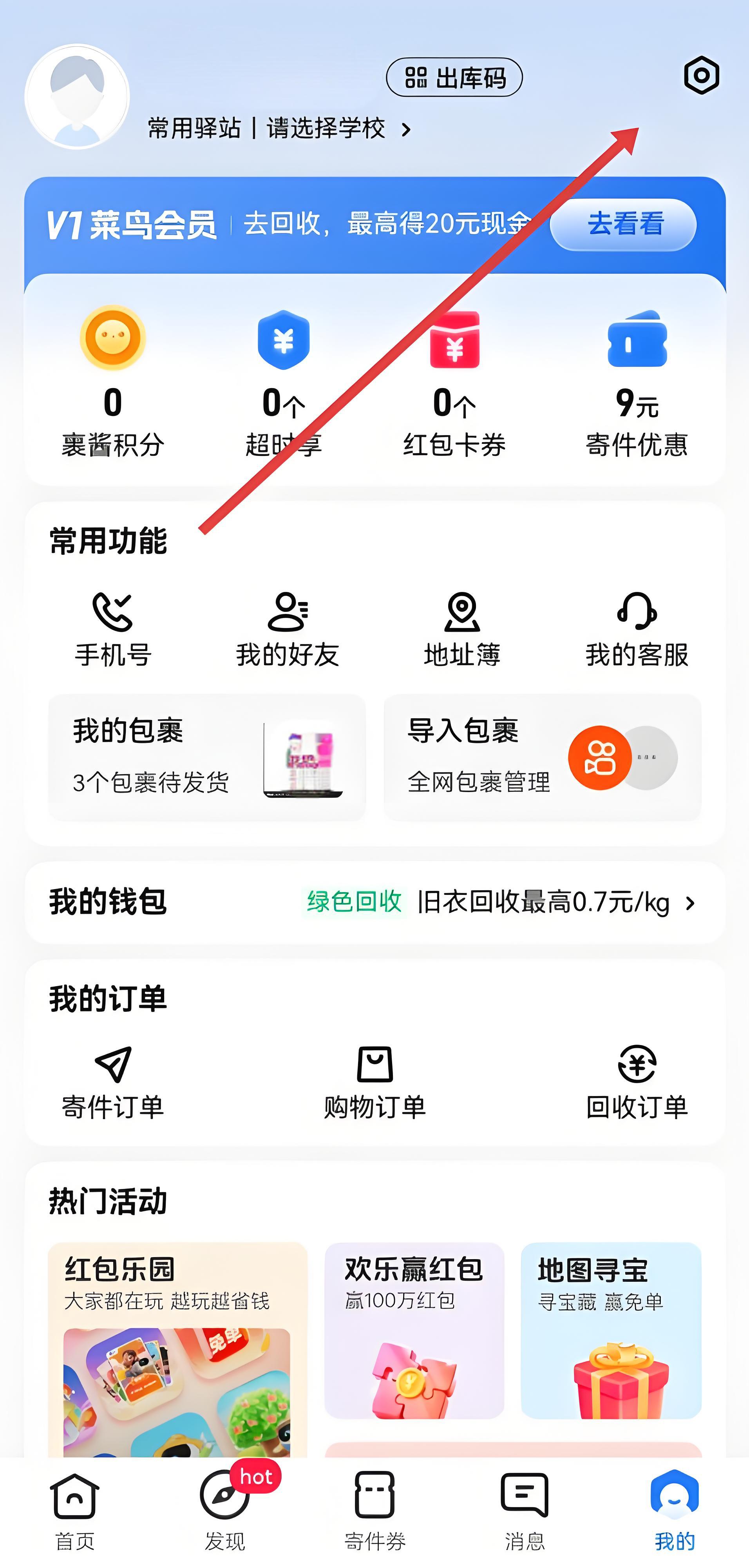 1、我们打开菜鸟APP,进入我的页面,点击右上角齿轮形状的设置图标,进入设置的界面。