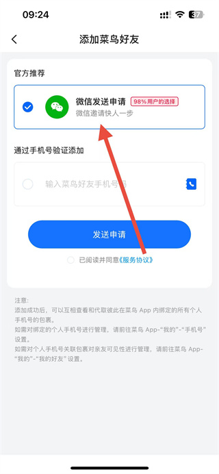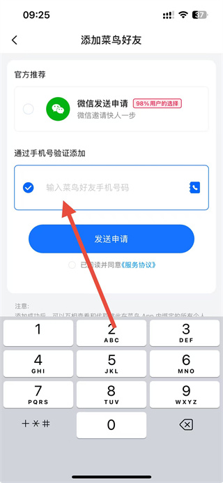 4、也可选择通过手机号验证添加,输入菜鸟好友手机号码后发送申请,完成亲友添加。