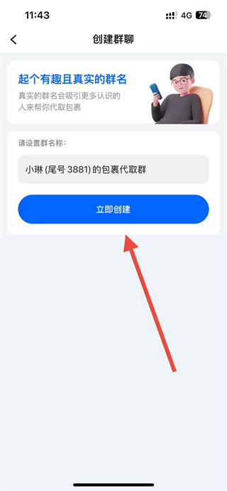 4、在创建群聊页面,设置群名称后点击立即创建按钮即可完成群聊创建操作。