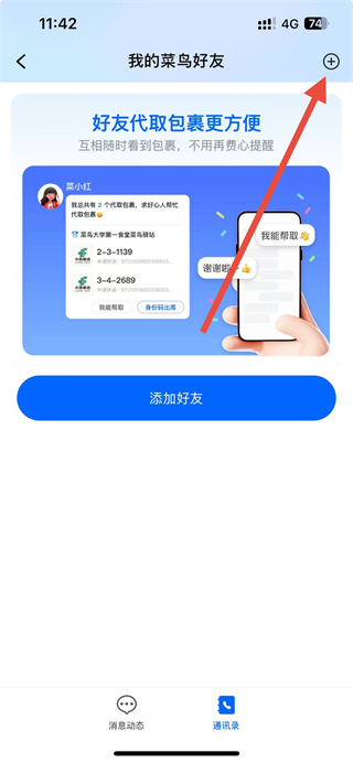 2、进入我的菜鸟好友页面后,点击右上角加号图标展开菜单。