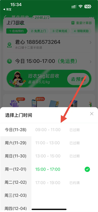 3、在页面选择地址和上门时间,挑选合适的上门时段。