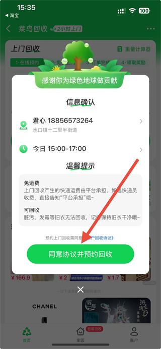 4、在跳出的弹窗,点击同意协议并预约回收,即可完成回收订单的下单。