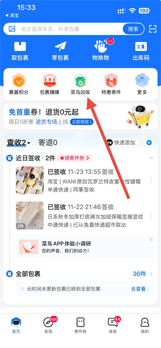 1、进入菜鸟主界面后,在上方功能区点击更多,找到并进入菜鸟回收页面。