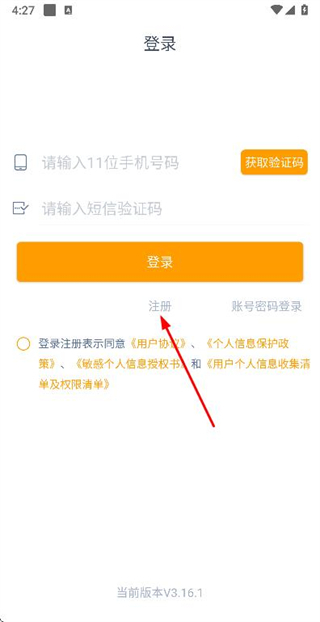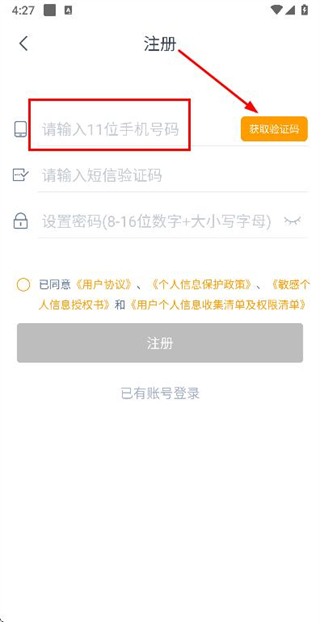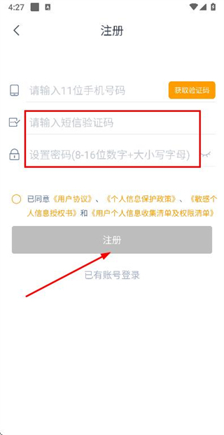 3、在注册账号页面填写验证码和密码,勾选协议后点击注册完成注册操作。