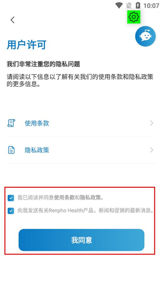 2、在用户许可页面,勾选同意使用条款和隐私政策等选项后,点击我同意,进入注册页面。