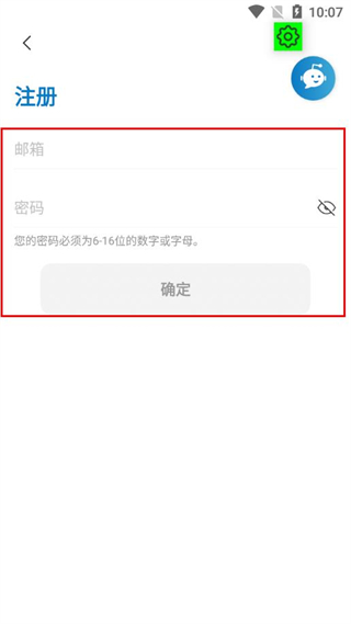 3、在注册页面填写邮箱、设置数字/字母密码,点击确定,完成账号注册。