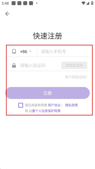 4、在快速注册页面填写手机号、获取并输入验证码,勾选同意协议后点击注册按钮,完成账号注册。