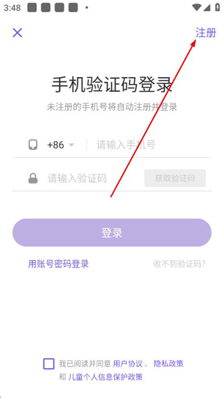 3、在登录页面点击右上角注册选项,进入快速注册页面。