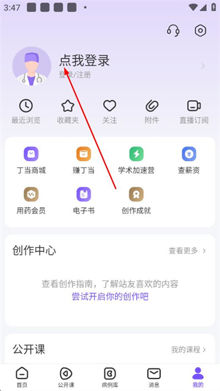 1、打开丁香园app首页,点击底部我的选项,进入个人中心页面。