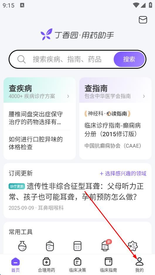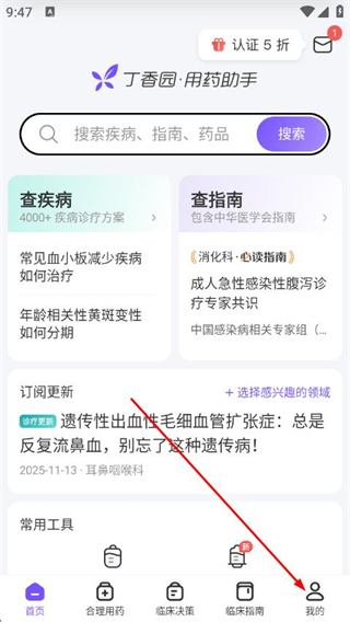 1、打开用药助手app首页,点击底部我的选项,进入个人中心页面。