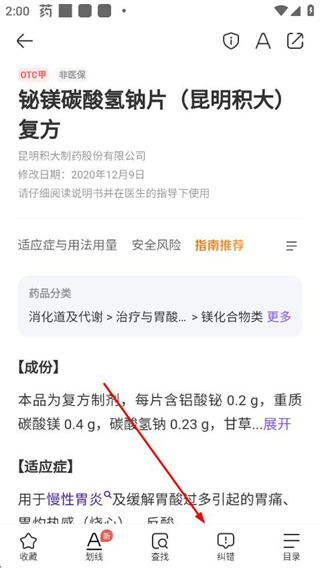 4、在药品详情页点击底部的“纠错”按钮,进入错误反馈页面。