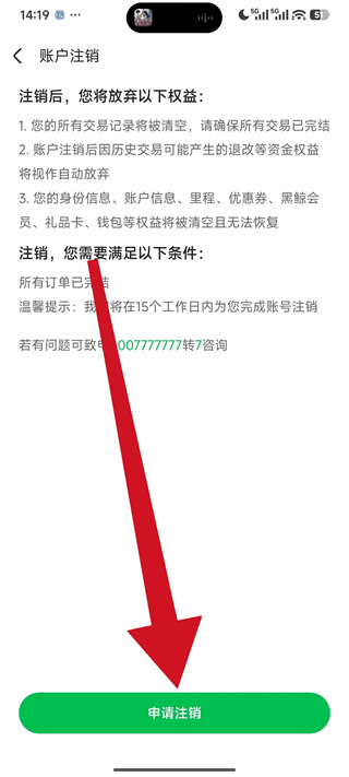 4、进入账户注销页面后,确认满足注销条件后,点击申请注销,按指引完成账号注销操作。
