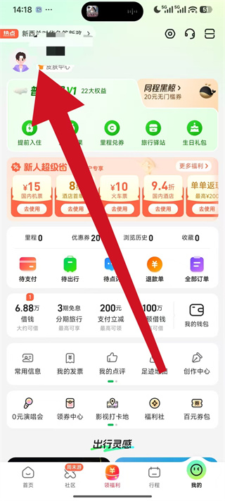 1、打开同程旅行,点击底部导航栏的我的,进入个人中心页面。