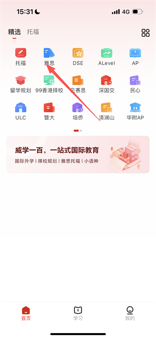 1、在威学一百首页,点击雅思选项,进入雅思学习功能页面。