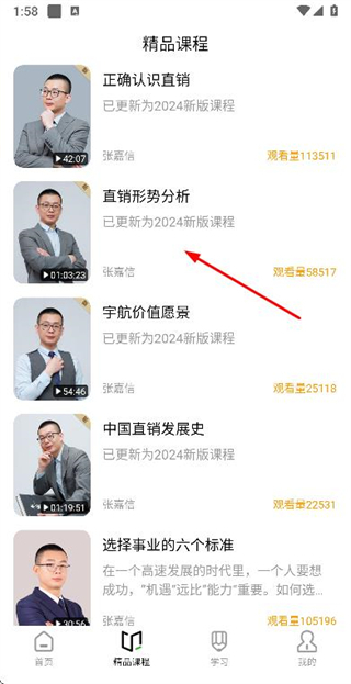 2、在精品课程列表页面点击目标课程,进入该课程的播放页面。