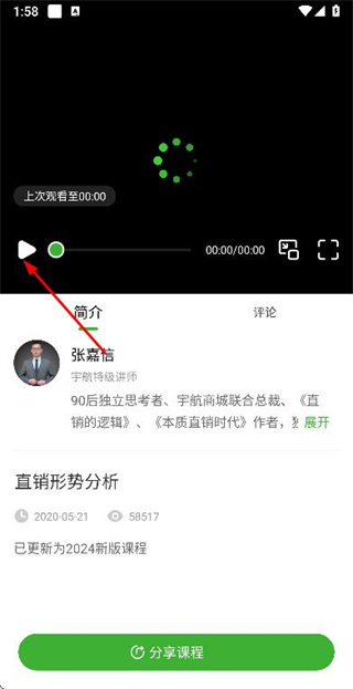 3、在课程播放页面点击播放按钮,开始观看该课程内容。