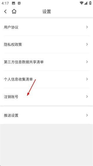 3、在设置页面,点击注销账号选项,进入账号注销页面。