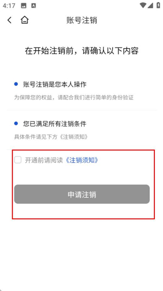 5、在注销确认页面,勾选阅读注销须知后点击申请注销按钮,完成账号注销。