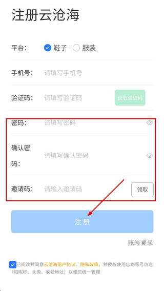 4、在注册页面,继续填写密码及确认密码,点击注册按钮,完成云沧海的账号注册。