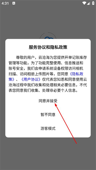 1、在服务协议和隐私政策弹窗中,点击同意并接受,进入登录页面。