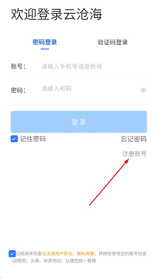 2、在欢迎登录云沧海页面,点击注册账号选项,进入注册云沧海的页面。