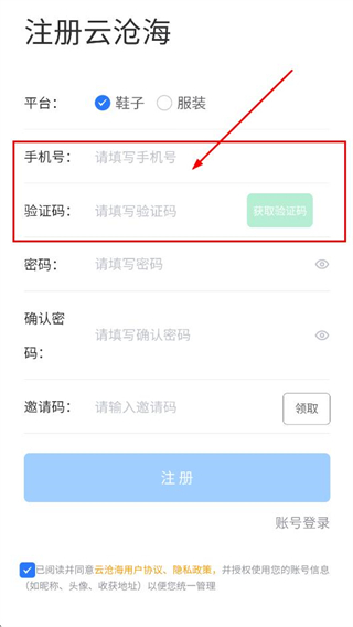 3、在注册页面,选择对应的平台,填写手机号,获取验证码并填入收到的验证码。