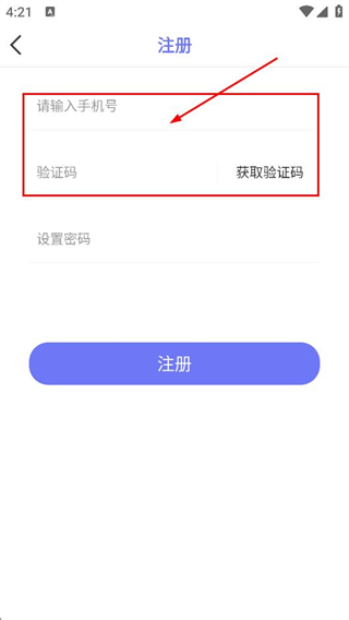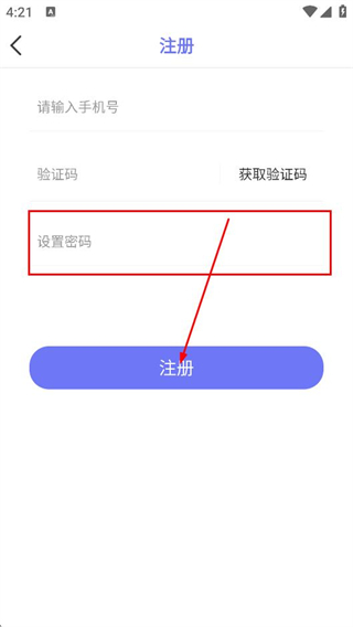 4、在注册页面,设置密码后点击注册按钮,完成该APP的账号注册流程。