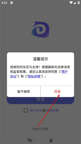 1、在该APP的温馨提示弹窗中,点击同意,进入APP的登录页面。
