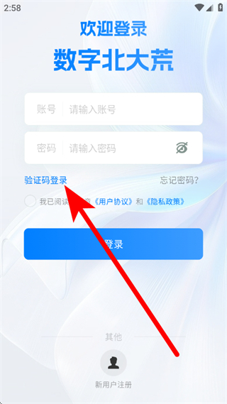 1、打开数字北大荒,在欢迎登录页面,点击验证码登录,进入验证码登录页面。