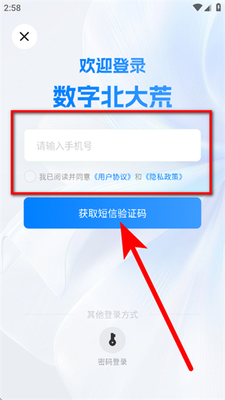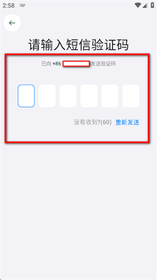3、在请输入短信验证码页面,将收到的验证码填入对应输入框,完成登录操作。