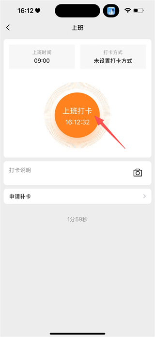 3、在页面,点击中间显示时间的上班打卡,完成当日的上班打卡操作。