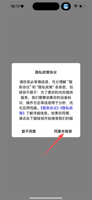 1、在该考勤的隐私政策协议弹窗中,点击同意并接受,进入考勤首页。