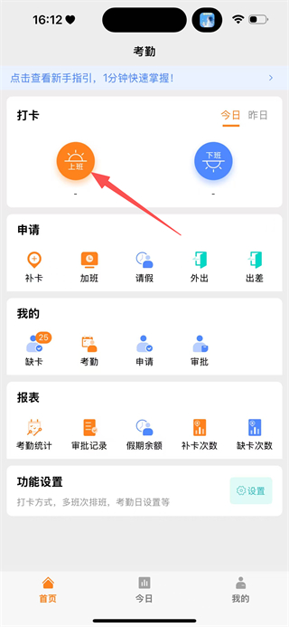 2、在考勤首页的打卡区域,点击上班按钮,进入上班打卡的操作页面。