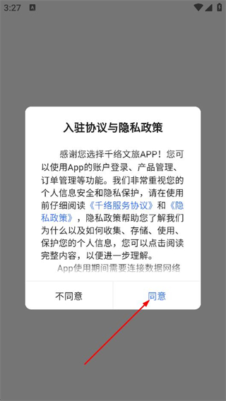 1、在千络文旅APP的入驻协议与隐私政策弹窗中,点击同意,进入登录页面。