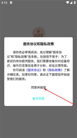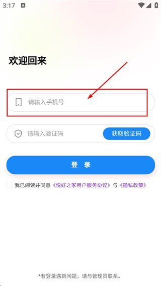 1、在悦好之家的服务协议和隐私政策弹窗中,点击同意,进入登录页面。
