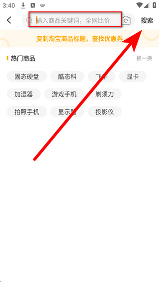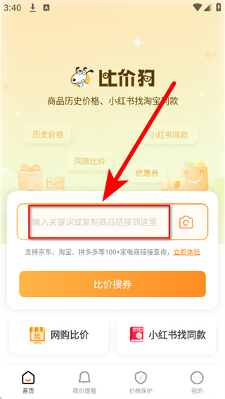 2、在首页的搜索框中,输入商品关键词,准备查询商品比价信息。