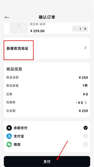 4、在确认订单页面,新建收货地址后选择支付方式,点击支付按钮完成购买流程。